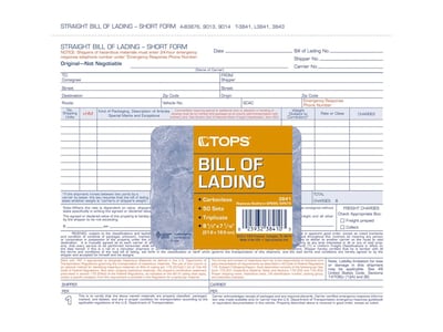 TOPS 3-Part Carbonless Bill of Lading, 8.5"L x 7"W, 50 Sets/Book (3841)