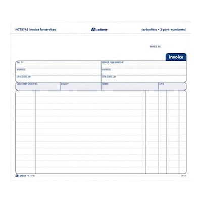 3-part carbonless Invoice form designed for service-based businesses and ample space for customization and description of services.