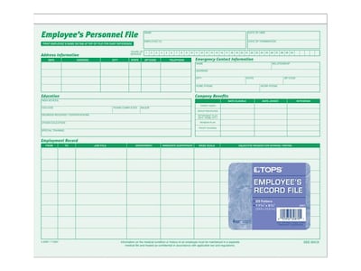 Maintain accurate records of staff payroll and performance with these employee record files. The preprinted forms provide space for personal contact information, benefits and other essential information, while the green hue makes it easy to color-code HR file cabinets. A reversible design lets you conceal sensitive information for added privacy. These TOPS employee record files feature a top-load format to keep important paperwork securely stored inside.