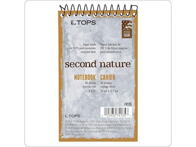 Jot down lists, notes or reminders in these TOPS Second Nature narrow-rule notebooks. The top-bound spiral layout makes it easy to flip through pages, and the narrow-rule sheets keep handwriting neatly aligned. Each of these TOPS Second Nature narrow-rule notebooks features 30 percent post-consumer content for a more sustainable approach to your office's paper needs.