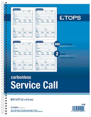 TOPS Service call book prevents write-through. Book has shaded area with check-off boxes for work completed.