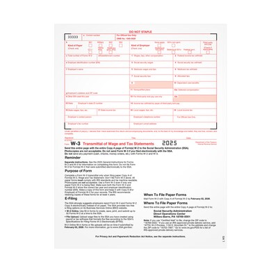 Adams Employee's Copies Cut Sheet 2025 W-3 Tax Form, 1-Part, 25/Pack (LW325)