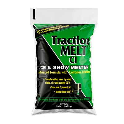 Traction Melt, an ideal solution from the Safety Supplies assortment. Each Sodium Chloride granule is encapsulated by Liquid Magnesium Chloride for fast-acting, environmentally friendly ice control. This is a very popular product used by many state and city departments of transportation. Melts to: 0ºF.