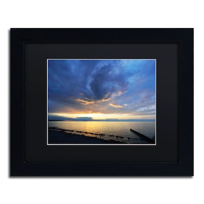 The "Trademark Fine Art KS0149-B1114BMF "Sweeping North Coast Sunset" by Kurt Shaffer 11" x 14" Framed Art, Black Matted" will make a lovely addition to your space. This photographic print with its sublime artistic appeal will uplift your space. Conceiv ed by Kurt Shaffer, this image captures the beauty in the fine details of the subject. This pastoral art work is a great choice for people looking for a wall decor item depicting nature in its truest form. It features a sunset over Lake Erie. Giclee tec hnology ensures a fine, high-quality resolution. A black mat further emphasizes the artwork. The artwork comes encased in a matt-finished black frame that complements any decor.