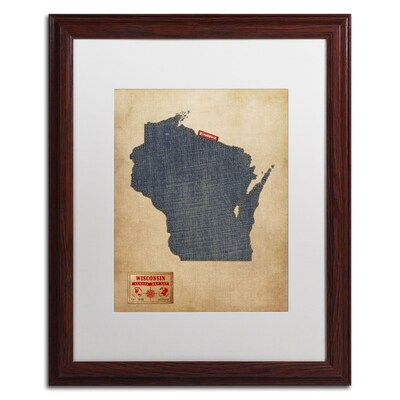 Trademark "Wisconsin Map Denim Jeans.." Wood framed art by Michael Tompsett has a ready-to-hang frame with a protective clear acrylic face. 16" x 20" Contemporary art with white matte finish includes a beautiful giclee printed design.