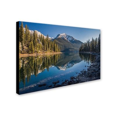 22" x 32" Pierre Leclerc "Jasper Morning" gallery-wrapped canvas art is ready to hang and features a landscape of mountains reflecting over water.