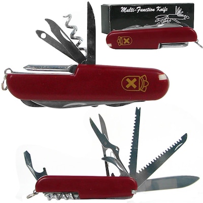 Trademark Whetstone™ 3 1/2" 13 Function swiss type army knife in red color consist of stainless steel blade to scissors, cork screw to screw driver.