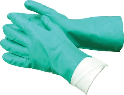 Ambitex® Flock lined work x-large gloves in green color is made of nitrile for oil and chemical resistance, sold as 12 per carton.
