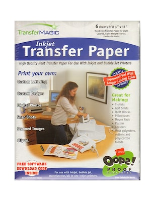 Turn your color pictures and artwork into wearable, washable art. Print your own artwork, snap shots, scanned images, clip art, or graphics then transfer them to t-shirts, golf shirts, quilt blocks, pillowcases, mouse pads, coasters, and most polyesters, cottons, and poly-cotton blends. Use light colored materials for best results. Ink Jet Transfer Paper (blue packaging) works in all ink jet and bubble jet printers including Epson, Hewlett-Packard, Canon, and Lexmark. Hand iron to transfer image. Six 8 1/2 in. x 11 in. sheets and detailed instructions included. Color Copier Transfer Paper (red packaging) is iron-on or heat press. Recommended for use with the following color laser copiers: Canon, Kodak, Xerox, and others. Do not user on ink jet, bubble jet, or color laser printers. No not use on black and white copiers. Avoid CLC 550, Xerox 5775, and Ricoh copiers. Three 8 1/2 in. x 11 in. sheets and detailed instructions included.