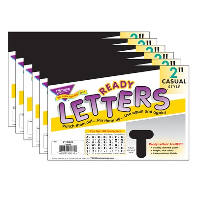 Lively letters, limitless possibilities! Convenient, reusable, and easy to use! Great for student work displays, bulletin boards, signs, banners, news boards, learning activities, labeling, and much more! Fade-resistant colors coordinate with TREND products. Durable. Each pack includes 100 uppercase letters, 20 numerals 0-9, 20 punctuation marks, and 2 blank sheets. Sold as 6 packs.
