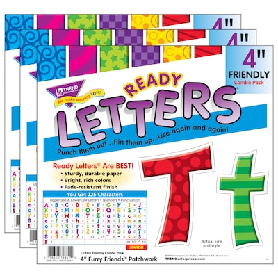 Lively letters, limitless possibilities! Convenient, reusable, and easy to use. Great for student work displays, bulletin boards, signs, banners, news boards, learning activities, labeling, and much more! Fade-resistant colors coordinate with TREND products. Durable. Each pack includes 50 uppercase letters, 82 lowercase letters, 21 numerals 0-9, 44 punctuation marks, and 28 Spanish accent marks in assorted colors and patterns. Sold as 3 packs. Coordinates with Furry Friends Collection.