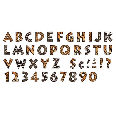 Trend Enterprises® 4" Ready venture uppercase letter set in animal prints pattern includes 50 uppercase letters, 10 numerals 0 - 9, 16 punctuation marks and 16 spanish accent marks. Set can be used on bulletin boards and news boards.