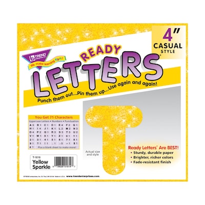 4" yellow sparkle uppercase read letter are great for use on bulletin boards, signs, news boards, showcases, student work displays, alphabet learning activities, banners, labels, and more.