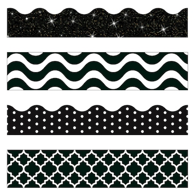Irresistible designs at your fingertips! Spruce up your spaces and rev up the fun with a convenient Variety Pack of Terrific Trimmers and Bolder Borders. Vibrant, contemporary designs create cheerful, inspiring classrooms, add pizzazz to parties and events, inspire clever hats 'n crowns, and dress up storage containers, cubbies, and shelves. Layer patterns on solids, sparkles, or metallics for extra WOW! Durable and reusable. Includes Black Sparkle Terrific Trimmers, Moroccan Black Bolder Borders, Wavy Black Bolder Borders, and Polka Dots Black Terrific Trimmers. 143'.