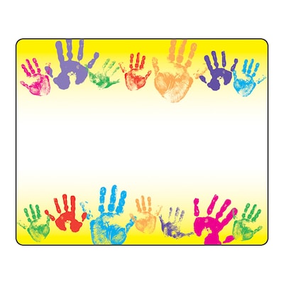 Trend Enterprises® Name tag ideal for grades K - 3 measures 3" x 2 1/2" and provides smooth finish for no-smear, easy writing using markers or pens. Name tag with rainbow hand prints design can be used as envelopes or box labels, sold as 36 per pack.