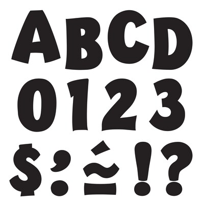 Trend Enterprises® 2" Playful uppercase letter set in black color includes 100 uppercase letters, 20 numerals 0 - 9, 30 punctuation marks and 18 spanish accent marks. Set is perfect for attention-getting messages.