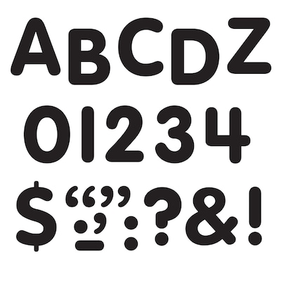 Trend Enterprises® STICK-EZE® 1" Letter/number/mark set in black color includes 184 uppercase letters, 50 numbers as well as 90 punctuation marks. Set with solid color design helps to create easy displays.