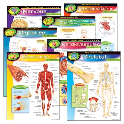 - Charts include Nervous System, Cardiovascular System, Reproductive, Endocrine, and Excretory Systems, Digestive System, Skeletal System, Respiratory System and Muscular System