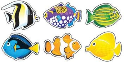 The multicolored TREND T-10822 Fish Mini Accents available in a pack of 36, includes 6 different designs in each set to add creativity to classroom projects and displays.