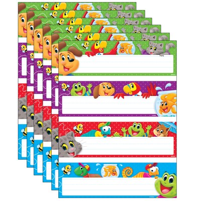 Four designs per pack makes it easy to group students, determine line order, conduct sorting activities, and more. Invite students to select their favorites to label their desks and lockers. Guidelines included for printing and writing practice. Coordinates with Playtime Pals collection. Measures 9.5" x 2.875". Includes 32 per pack. Sold as 6 packs for a total of 192 name plates.