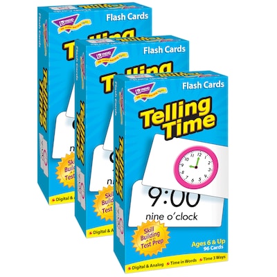 Content-rich time cards do their job, teaching students new skills in a fun way. This educational aid helps students tell time using analog clocks, numbers, and words. Self-checking, answers on back. Sturdy cards and storage box. Students will delight in mastering new skills. No-see-through cards with quick-sorting, rounded corners. 96 cards per pack, 3" x 6". For ages 6 and up. Sold as 3 identical packs of flash cards.