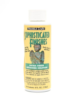 Create the look of verdigris overnight instead of years with this liquid of special salts and oxidation agents. It can be used with Modern Options Metallic Surfacers , or on real copper, brass, or bronze. Patina Green Antiquing Solution provides contras t and texture on detailed surfacers. It-s perfect for a wide variety of home décor, craft, and art projects. The solution is easy to apply - no special tools required - and can be used indoors or outdoors. It-s also water-based, so you can clean it up e asily. Patina Green Antiquing Solution is available in 4 oz., 8 oz., and 16 oz. bottles.