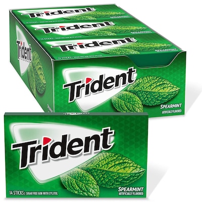 Whether purchasing snacks for a vending machine or adding products to a company store, this Trident Spearmint chewing gum is sold in bulk packaging to save time and money. Each box contains 12 packs, and each pack contains 14 pieces of gum, which makes it easy to purchase for everyone.