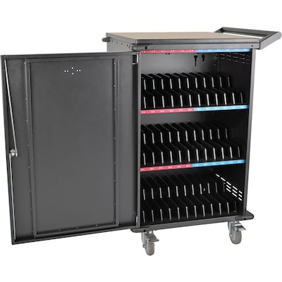 The CSC36AC 36-Device AC Charging Station Cart provides timed AC charging, secure storage and cord management for 36 Chromebooks and laptops with a screen size up to 15 inches. The connected devices' AC adapters plug into the cart's 36 NEMA 5-15R outlets as needed. To conserve energy and avoid potential overloads, the outlets are evenly split into two charging zones. Each zone charges for one hour at a time until a built-in timer switches to the other. An RJ45 jack allows you to connect external Ethernet equipment, such as wireless hotspots, inside the cabinet. The laminated wood-grain top acts as a writing surface and holds a projector and other devices that plug into two external NEMA 5-15R outlets. An inside switch can turn these outlets off to protect against overloads. Constructed from heavy-duty steel covered with a black powder-coated finish, the CSC36AC provides safe, secure storage. The front and back doors lock to help prevent theft, damage and tampering, and flow-through ventilation helps prevent devices from overheating. To prevent cable clutter, device power adapters stow away in removable baskets. Charging cables run through zoned slots and into an overhead cablemanager. Moving devices from room to room is easy. Large swivel casters with non-marking wheels improve the ride over uneven surfaces and lock to help prevent unwanted movement. The reversible wide-grip handle makes the cart easy to control. Corner safety bumpers protect walls and doorways from scratches. Features: Charges 36 Chromebooks and Laptops Up to 15 in. Device power adapters plug into internal NEMA 5-15R outlets (up to 1,440 watts total) Also charges tablets and other USB devices through their power adapters Extra internal AC outlet for powering peripherals RJ45 jack for external Ethernet networking 10 ft. AC input cord with NEMA 5-15P plug reaches distant outlets Timed Device Charging to Guard Against Overloads Internal outlets split into 2 color-coded zones of 18 outlets each Timer alternates charging between zones hourly LEDs i