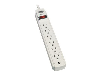 Tripp Lite Surge suppressor features 6 ac outlets, 8 foot cord and right angle flat plug. Surge suppressor has built-in power switch and 15 A circuit breaker that offers power control and overload protection over all outlets.