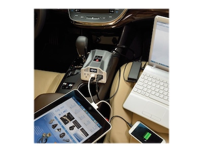 The Tripp Lite PV400USB PowerVerter 400W car inverter is the perfect portable power solution for business travelers. Power a variety of appliances and electronic equipment by just plugging them into any dashboard lighter or 12V receptacle. This ultracompact inverter converts stored power from any 12V battery or automotive DC source to safe, stable, computer-grade 120VAC power for unlimited run time. Prevent it from tipping over or sliding around during travel by fitting it into your vehicle's cup holder. The inverter has a DC input jack with a convenient 3' cord, while the durable plastic housing withstands the rigors of road trips. A built-in ventilation fan keeps the inverter's interior cool during extended use.