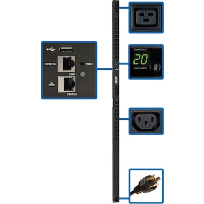 The PDUMV20HVNETLX 3.2-3.8kW Single-Phase Switched PDU provides advanced network control and remote power monitoring with the ability to turn on, turn off, reboot or lock out power to each outlet. Recommended for any IT or industrial application, it features 24 switched outlets (20 C13 and 4 C19) with included plug-lock insert sleeves to prevent cables from becoming accidentally disconnected. A 10-foot cord with NEMA L6-20P plug connects the PDU's C20 inlet to a compatible AC power source, generator or protected UPS. The built-in Java-free HTML5-based LX Platform network interface enables full remote access for PDU status monitoring and email notifications via secure web browser, SNMP, telnet or SSH. It supports 10/100 Mbps auto-sensing for optimum communication with an Ethernet network. Optional EnviroSense2 modules (sold separately) provide a variety of environmental monitoring capabilities. Protocols supported include HTTP, HTTPS, SMTP, SNMPv1, SNMPv2, SNMPv3, telnet, SSH, FTP, DHCP and NTP. A digital ammeter allows you to monitor each bank's load in real time to ensure it remains well below maximum capacity with no danger of overload. The vertical PDU mounts in 0U of space in EIA-standard 19-inch racks using the included toolless mounting buttons or the included rack-mounting brackets. Use the included PDUMVROTATEBRKT kit to install the unit with outlets facing the rear for better airflow or equipment access.