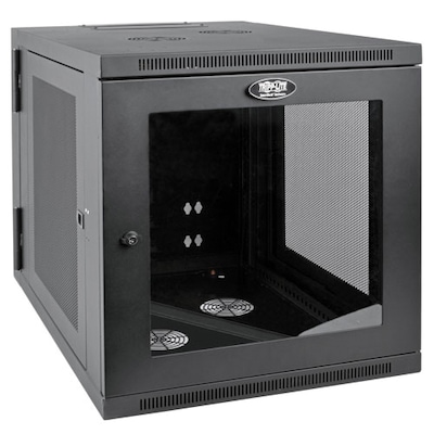 The Tripp Lite SRW12US33G SmartRack 12U wall-mount rack enclosure cabinet in black, is perfect for network closets, retail locations, classrooms and other areas with limited floor space where you need equipment to be secure or ganized and out of the way. This cabinet measuring 25" x 23.63" x 33.5", has durable steel/acrylic construction for longer endurance. Cabinet with 250 lbs weight capacity, has extra-deep capacity to accommodate most 1U servers, UPS systems, battery packs and switches. This cabinet swings away from the wall to offer easy access to equipment and cabling during installation/maintenance. It comes with two keys, 36 M6 screws, 36 M6 cage nuts, 36 M6 washers and 36 12-24 screws for added convenience.