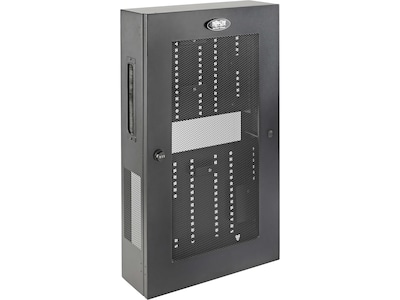 This Tripplite SmartRack heavy-duty steel enclosure secures and houses both regular rack equipment and other equipment not typically mounted in an EIA-standard 19" rack. It is recommended for wiring closets, retail locations, classrooms, back offices and other areas with limited floor space where you need audio/video, voice and data infrastructure to be secure, organized and out of the way. Constructed with a durable black powder-coated finish, the vertical equipment rack has a maximum load capacity of 150 lbs.