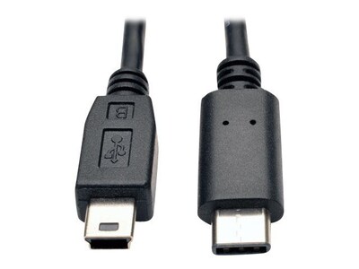 The Tripp Lite male/male high-speed cable connects devices with a 5-pin mini-B connector to the USB type-C port on your tablet, laptop, ultrabook or computer. The 6' cable supports USB 2.0 data transfer rates up to 480 Mbps and 500 mA current. This cable is backward compatible with previous USB generations. It has gold plated contacts and molded ends for longer use.