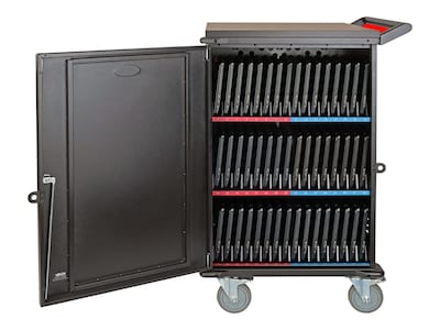 Tripplite mobile charging cart accommodates up to 48 Chromebooks and laptops. This 120V charging cart provides timed AC charging, secure storage and cord management for as many as 48 Chromebooks and laptops. The connected devices' AC adapters plug into 48 NEMA 5-15R outlets, which provide up to 1,440 watts for charging. A built-in circuit breaker protects the devices against overloads. High-Speed Zone Charging Conserves Energy and Helps Avoid Potential Overloads. The 48 NEMA 5-15R outlets are split evenly into two color-coded charging zones to support more devices and higher wattages without overloads. A built-in timer alternates charging zones every hour. LEDs indicate which zone is being charged at any given time.