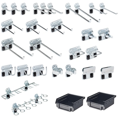 - Includes: (3) 1 in. Single Rod 30 degree bend: (3) 3 in. Single Rod 30 degree bend; (2) 4 in. Single Rod 30 degree bend; (2) 6 in. Single Rod 90 degree bend; (3) 3 in. Double Rod 90 degree bend; (2) 5-3/4 in. Double Rod 80 degree bend; (2) Extended Spring Clips; (2) Standard Spring Clips; (3) 2-1/4 Curved Hooks; (2) Closed End Hammer/Pliers Holders; (1) Multi-Prong Tool Holder; (1) Multi-Ring Tool Holder; (2) BinClips; (2) Black Plastic Hanging Bins.
