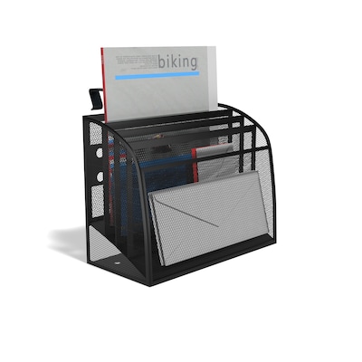 Keep your work surface clutter-free with this mesh tiered wall file. Flat square-rounded edges create a modern profile that pulls together your space, while the four slots deliver a handy document storage option. This TRU RED™ black mesh tiered wall file includes wall file hangers to maximize space and hardware so you can easily mount them on a wall for a more permanent setup.