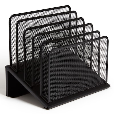 Manage projects by filing folders in this mesh incline file organizer. With six tiered compartments to store files and folders, this desk organizer keeps contents visible for quick access. Tightly woven mesh construction offers long-lasting use, and integrated feet prevent scratching and slipping. Boasting a matte black finish and flat rounded edges, this TRU RED™ mesh incline file organizer brings a modern look to your workspace.