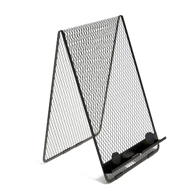 Customize your workspace with this document holder. The angled design lets you view paperwork and screens at a glance, while the integrated slot makes it easy to use and charge your tablet or smartphone. Included magnets hold pages securely in place as you look up figures or type out forms. Featuring a neutral color and flat rounded edges, this TRU RED™ matte black mesh document holder offers a contemporary look.