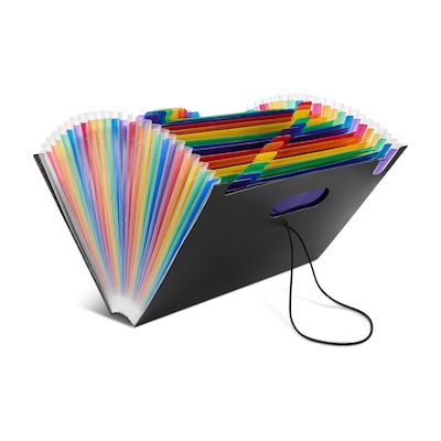 Coordinate all your forms and reports with this multicolor expanding accordion file. The plastic design is water-resistant and tear-resistant to protect stored documents from damage, while the multicolor pockets let you organize your paperwork for improved productivity. This Staples letter-size 25-pocket multicolor plastic expanding accordion file has a full elastic top closure for keeping your files in place and 25 pockets for a handy document storage option.