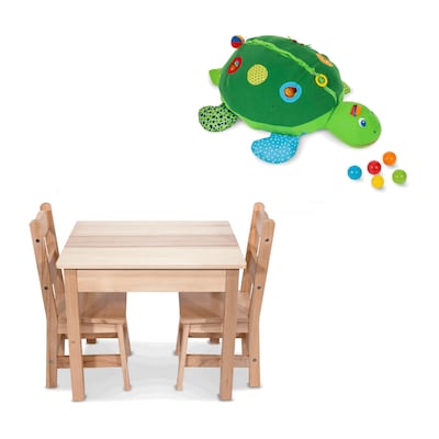 The giant, friendly turtle comes filled with 60 squeezable multi-colored balls that are easy to grasp, toss, and roll. Zipper and self-stick tabs open so baby can sit inside, and close to store balls and to make a fun pillow. Features include holes to push and pull balls through, a non-slip bottom, crinkling feet, squeaking button, textured ring, mirror, silky fabric tags, and attached soft ball rattle. This hardwood table-and-chairs set has a timeless natural finish that fits with any home décor, and wipes clean to stay looking crisp and clean. The three wooden pieces are simple to construct with just a Philips-head screwdriver, and incredibly sturdy once assembled. Top the table with a child's favorite puzzles or use it for arts and crafts, tea parties, puzzle play, lunch and snacks, and so much more! Two chairs have an 11in seat height and reinforced, tip-resistant design.