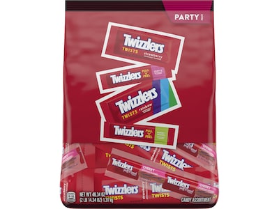 With a bulk party pack of assorted Twizzlers chewy candies ready for action, you'll never find yourself without a delicious shareable snack. This party pack includes Twizzlers Twists Strawberry flavor chewy candy, Twizzlers PULL 'n' PEEL Cherry flavor chewy candy, Twizzlers Twists Rainbow flavor chewy candy, and Twizzlers PULL 'n' PEEL Watermelon flavor chewy candy. Whether you're in the mood for a classic Twizzlers treat or want to try a new vibrant flavor, you'll be set with this assortment party pack. Keep your pantry stocked with kosher-certified Twizzlers chewy candies, store some in your work desk, or take a bag on a road trip or to your next party gathering. Looking for an even greater adventure? For a unique twist, melt several white creme or milk chocolate bars (sold separately), dip your Twizzlers candies in the melted gooeyness, then cover each piece in sprinkles, and let the new treats cool. They even make scrumptious holiday treats for Christmas stocking stuffers, Halloween trick-or-treat bags, Easter baskets, and Valentine's Day presents.