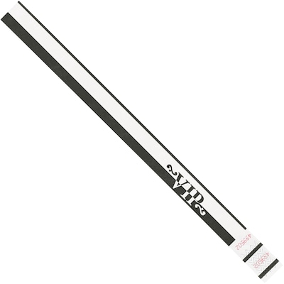 3/4 x 10" Black "VIP" Tyvek® Wristbands. Perfect for identifying those at your short term event. Fits most wrist sizes. Lightweight bands are waterproof and tear resistant. Breathable and comfortable to wear. Sequentially numbered.