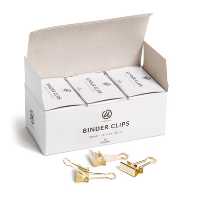 It's often attention paid to the smallest details that really creates the feel of a space. Elevate your workspace, desk or simply your binder with a touch of sophistication and luxury when you use this 72-count set of small, gold binder clips. Although they are small, these clips are fierce with metallic gold exteriors and enough versatility to help you organize all your documents from family records to school assignments and more. Sized at 19mm, these clips are ideal for smaller collections of paper. Need something larger? They are also available in a 32mm size and if the warm undertones of gold don't compliment your space, we also offer these stylish accessories in silver. Use them in combination with our other products that will help build the golden aesthetic and give yourself a complete set. U Brands is a dynamic, new company focused on a complete and diverse line of stationery, office, and home goods. We are developing some of the most unique and inspiring stationery and home office products. Our pledge is to deliver innovative and creative designs with great quality and value.