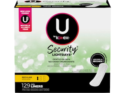 Get a clean, dry feeling with the U by Kotex Security LightDays panty liner featuring XPRESS DRI technology which absorbs in seconds. Dermatologist-tested to be gentle on skin, this panty liner has no harsh ingredients, is hypoallergenic, and made without perfume or lotion. The U by Kotex Security LightDays panty liner for women is also breathable and features a cottony soft-touch cover for your comfort. FSA-/HSA-/HRA-eligible in the US. Packaging may vary from images shown.