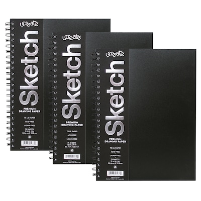 Premium sketch book with a durable black poly cover and back. Each book contains 75 sheets of heavyweight, acid-free drawing paper. The spiral binding lies flat for comfortable drawing and sketching. Ideal for sketching and drawing with dry media. Sheets are perforated for final art. Acid-free. Sold as a pack of 3 books.