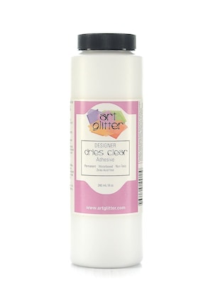 Designer "Dries Clear" Adhesive is a permanent, industrial-strength, non-toxic adhesive that dries acid-free, transparent and remains flexible. Use under opaque glitter 100% of the time. You'll use Dries Clear under transparent glitter 95% of the time to show off their sheer and icy qualities.