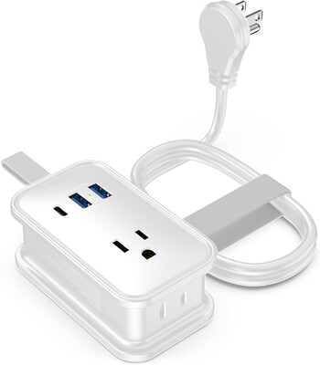 Get the power you need with a sleek flat-plug power strip by Uncaged Ergonomics. This portable three-outlet charger has two USB Type-A ports and one USB Type-C port (20W Power Delivery). The flat-plug extension cord conveniently wraps around the charger body for compact storage. A bungee strap keeps the cord in place, and a simple hang loop makes it easy to attach the charger to your bag. The whole USB power strip is about the size of a computer mouse, so small that your excuses for not taking it with you just vanished. This charger is designed to be a must-have travel accessory: it's perfect for the digital nomad, frequent flier, or as a cruise accessory. The portable 3' extension cord converts one wall outlet into six, giving you ample outlets to power all of your devices, and the flat plug takes up minimal space.
