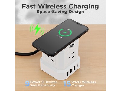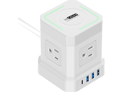 The Uncaged Ergonomics Cube surge protector power strip with USB ports delivers clean, safe, and efficient power to up to nine devices. This space-saving power strip tower features four outlets (1625W), three USB ports (2.4A), one USB Type-C (20W, fast charging), and a wireless charging pad. The 10' extension cord gives plenty of reach to place this mountable surge protector power strip with USB ports wherever it's most convenient. The on/off switch helps you save power without all the plugging and unplugging required of those long, clunky power strips. If you're looking for a high-quality space-saving surge protector power strip with USB ports and a wireless charging pad, then this is the modern wall outlet extender you need.