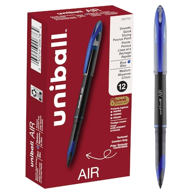 Enjoy a smooth writing experience with AIR Porous Point Rollerball Pens from uniball featuring a 0.7mm medium point. These pens have an innovative sleek tip that writes at any angle while producing crisp, skip-free lines. The porous point rollerball pens adapt to your personal writing grip style, adjusting line widths depending on the pressure of your hand as you write. Combining the fluid ink of a marker with the durability of a rollerball, these pens deliver a smooth writing experience while ensuring your documents are easy to read. Suitable for a variety of writing tasks including journaling, scrapbooking or sketching, these pens are available in assorted colors that glide easily over paper, delivering vibrant marks and lines. uni Super Ink technology ensures the ink adheres strongly to the paper, offering protection from fraud, fading and water. A glass-like plastic clip gives these fine marking pens a stylish look while adding a touch of convenience. Experience effortless writing the moment the pen hits the paper with AIR's versatile cushion tip technology and fluid, free flowing ink.